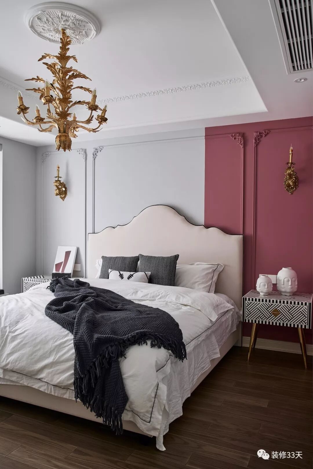 ▲ 主卧,选用拼色背景,用明亮的色彩对比,带来双面风情,黄金比例分割突出个性而有趣的氛围,黄铜色植物形状的吊灯,给空间带来复古高贵的气息