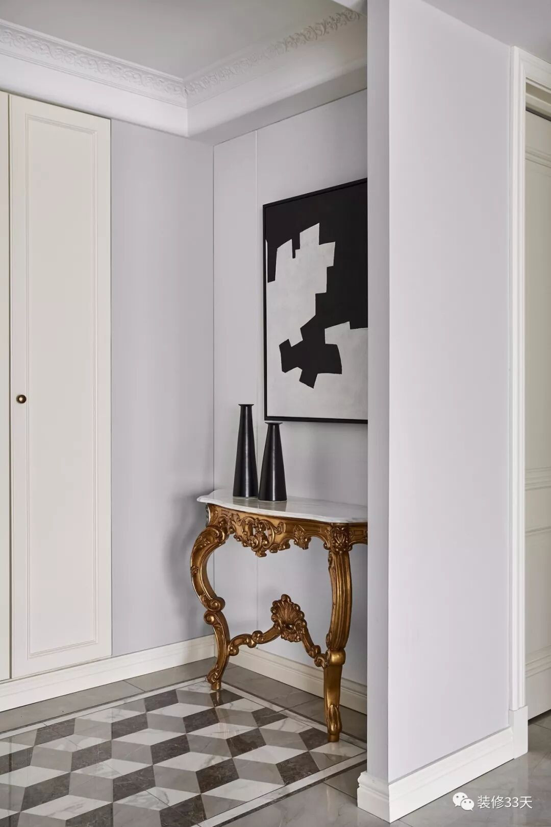 ▲ 使用面积125平,个性全案全包,玄关,几何拼接地砖更立体,黑白抽象挂画搭配古典风格的玄关柜,形成强烈对比,为满足功能需求,在沿入户方向做一组鞋柜,便于收纳