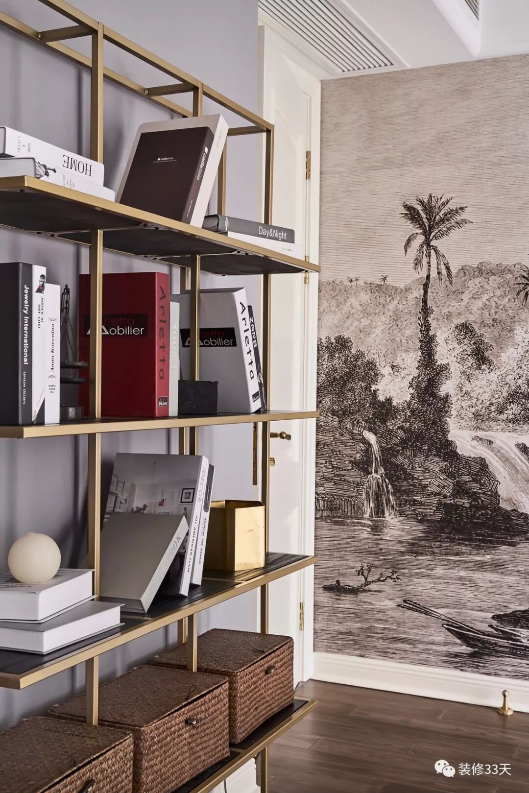 ▲ 简约的黄铜书架,表现出独特的艺术骨感,没有过多的装饰,将轻奢发挥的淋漓尽致,山水画的运用让书房更显灵气