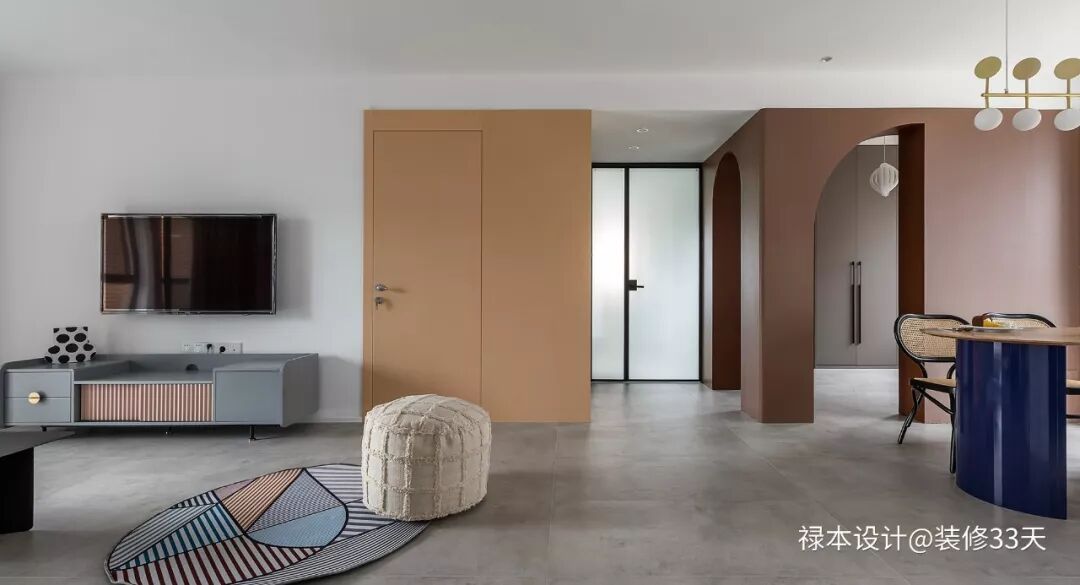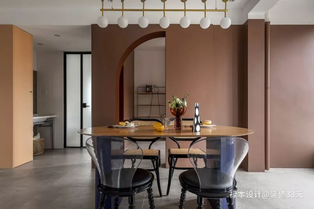 ▲ 餐厅和书房位置通过咖色墙面和拱形门设计,延展餐厅空间并促进互动性