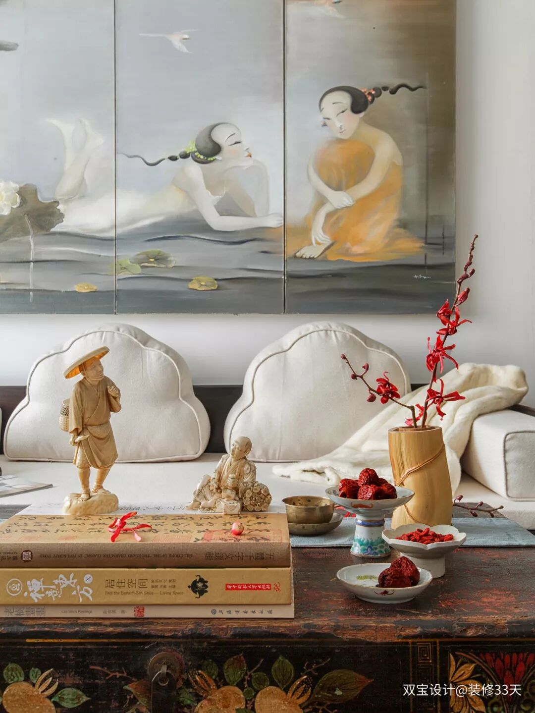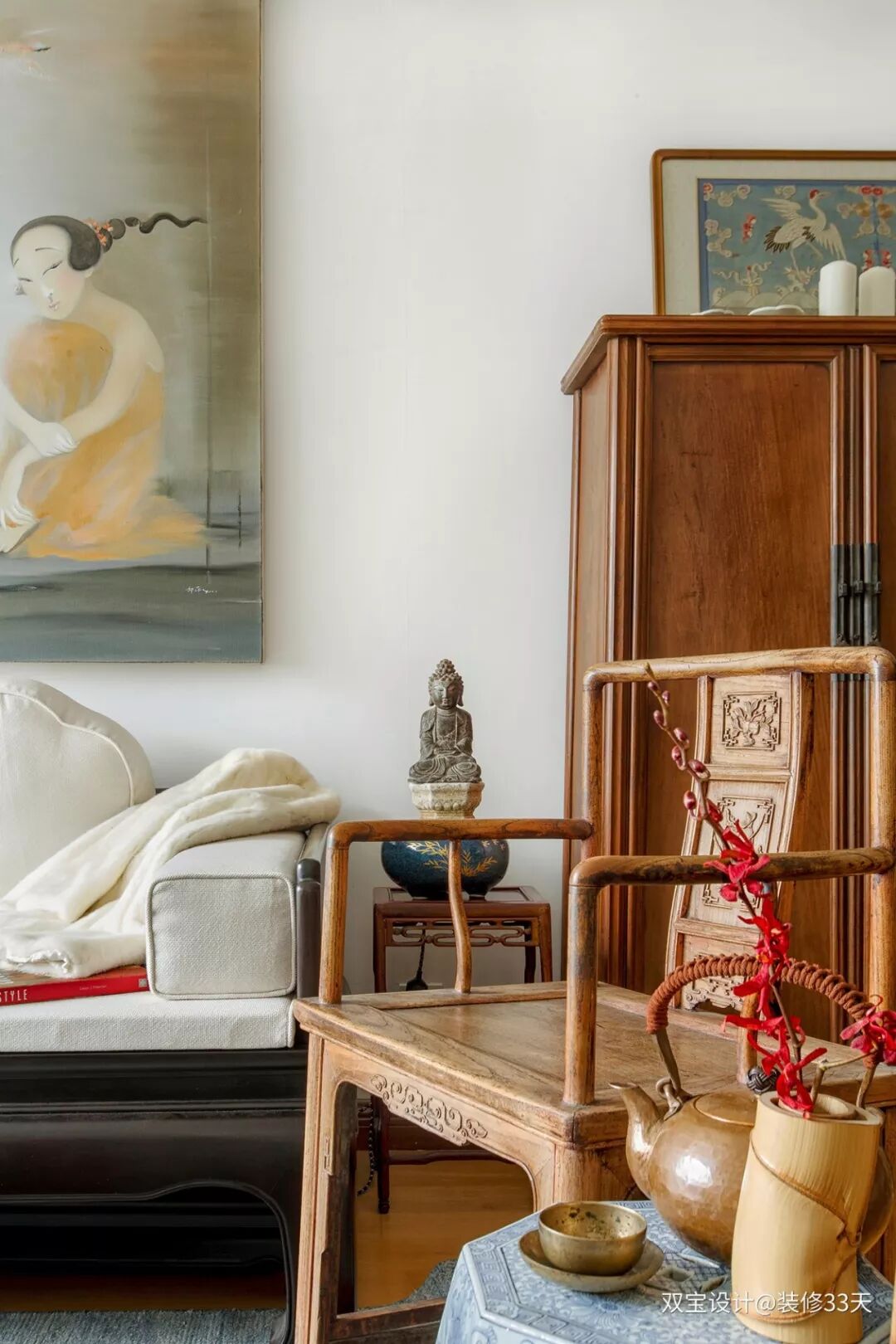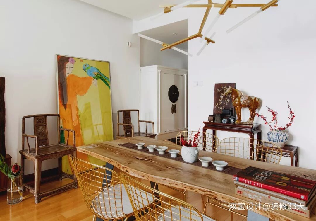 ▲ 留白的硬装空间,现代元素配上老物件家具,以艺术家郝萍的挂画为背景