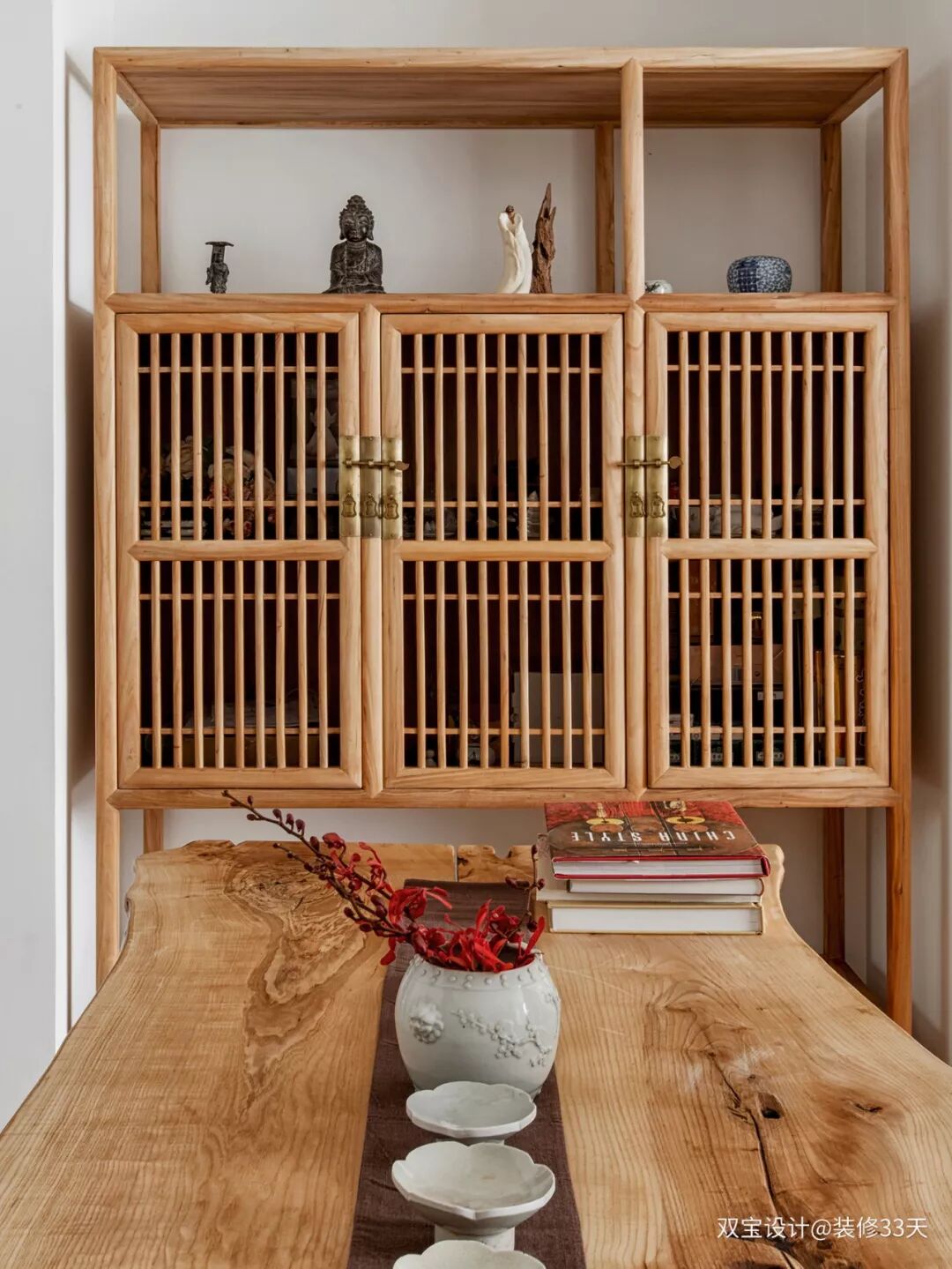 ▲ 桌上摆放的书籍凸显主人的文人气息,木质储物柜沉稳大气,家具风格与整屋格调完美融合