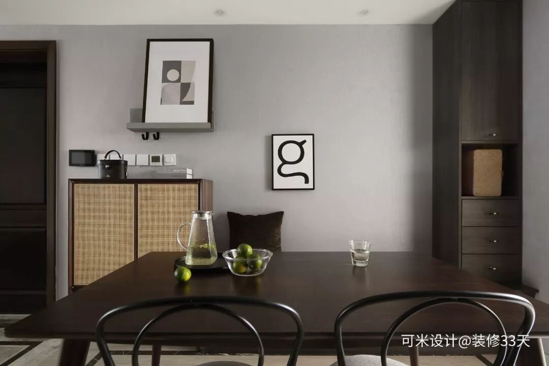 ▲ 餐厅紧挨入户区,餐厅左侧是一组黑胡桃木藤编鞋柜,右侧设计一组收纳餐边柜,背景点缀两幅装饰画,一个黑胡桃色的餐桌、卡座和两把布艺与铁艺靠背结合的餐椅构成实用性就餐场域