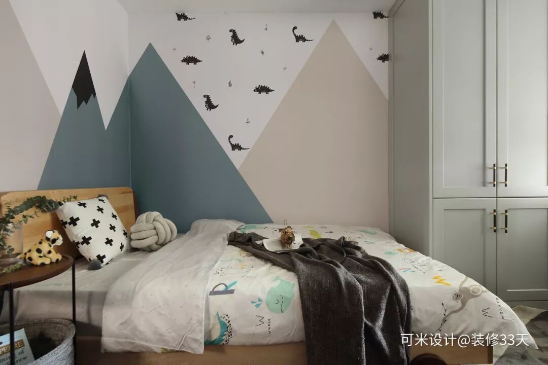 ▲ 儿童房,墙面铺贴定制壁纸,图案与色彩充满童趣与活力,选择圆角床头实木床,环保和安全是儿童家具选择的要点