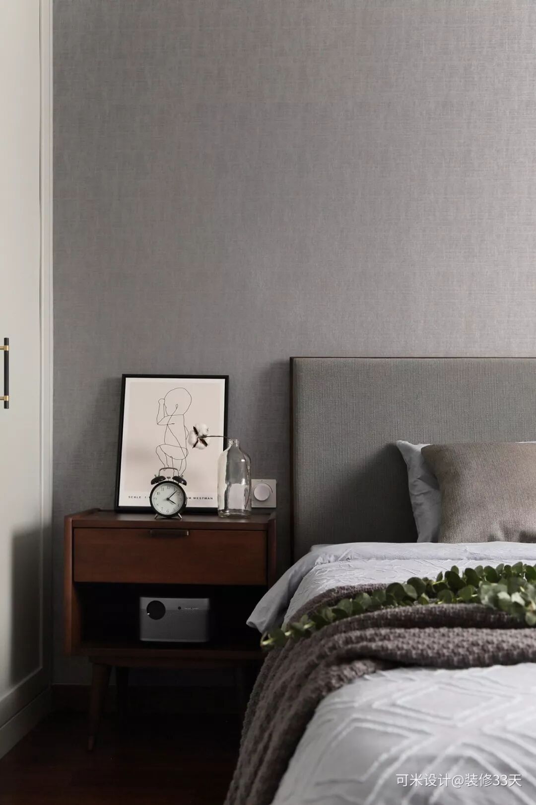 ▲ 主卧,深色木地板搭配满铺灰色壁纸,采用同色调床背搭配一款立体印花的蓝色床品,营造出一份美丽与安详的氛围