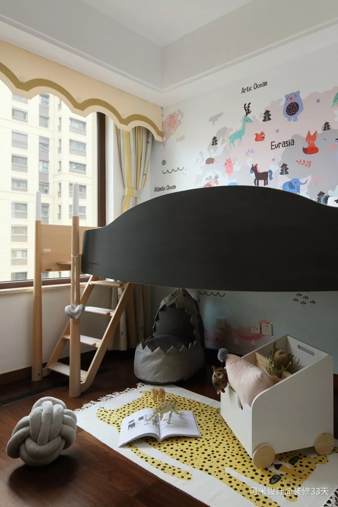 ▲ 床下是孩子玩乐的空间,卡通的棉质地垫,鲨鱼形状的小沙发,带推车功能的收纳箱,可以收纳很多小玩具,为小主人打造一间充满童真的小天地