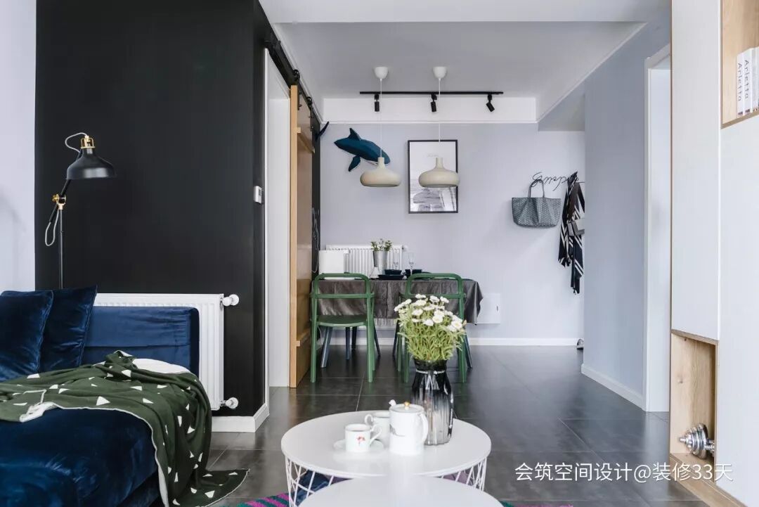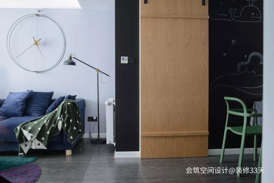 ▲ 客餐厅的转角墙面打造成可涂鸦的黑板墙,与原木色谷仓门融为一体