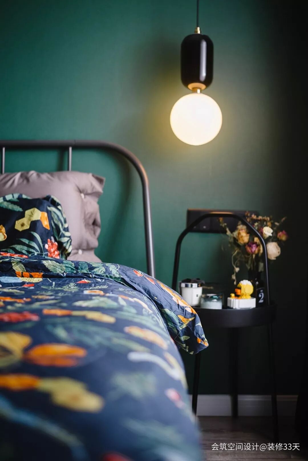 ▲ 床头特写,轻巧的家具搭配居家小单品,暖黄的灯光减少铁艺带来的冰冷感,也让整个房间充满文艺质感