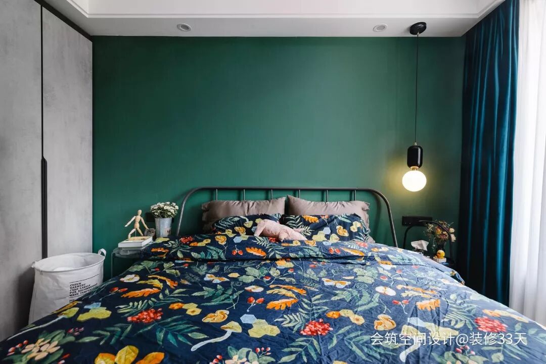 ▲ 铁艺大床搭配水泥质感柜门,墨绿色头背景与床品相映成趣,形成一种别有情调的色彩组合