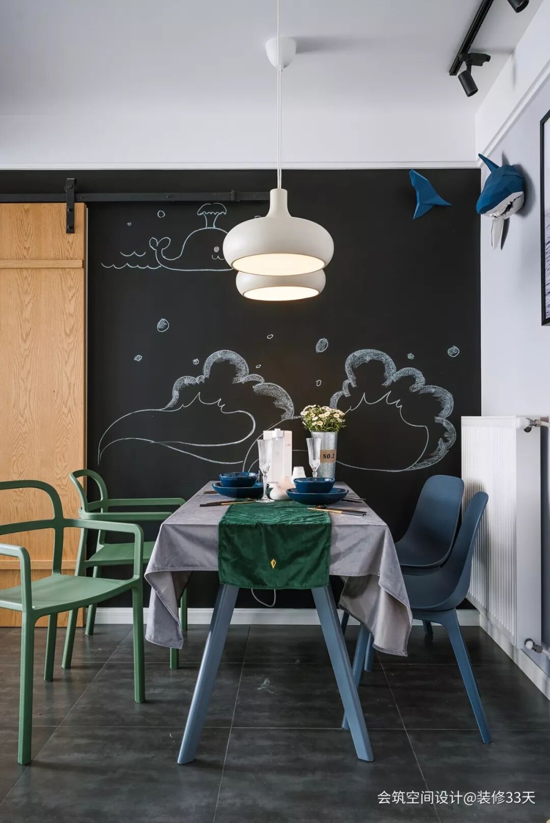 ▲ 餐厅,蓝绿色系的餐桌椅,清新自然,搭配黑板的粉笔画背景与鲨鱼墙饰,趣味十足,造型圆润的吊灯营造就餐氛围