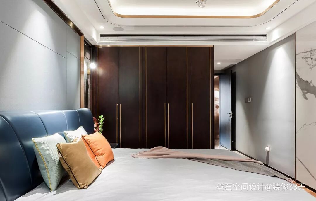 ▲ 深蓝色皮质高背床搭配灰蓝色硬包背景,不同层次的光源营造空间氛围