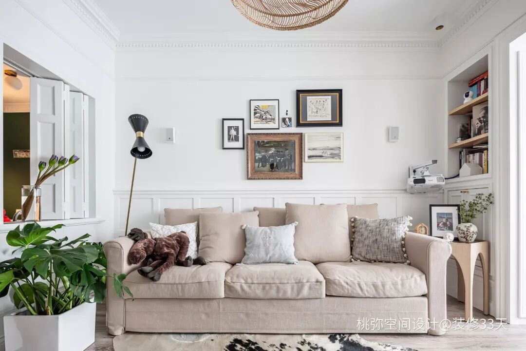 ▲ 客厅,自制装饰画既独特又提升空间的文艺气质,靠墙打造内嵌的储物格,投影仪器和各种音响这些是男主最爱
