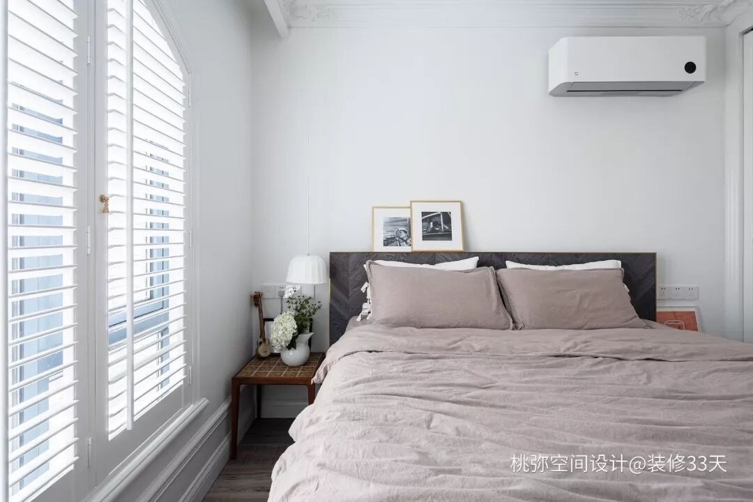 ▲ 主卧的色调也极为简洁,却夹杂不少的复古元素做点缀,百叶窗帘、百叶柜门、床头凳、斗柜等呼应着整体 mid century 风格
