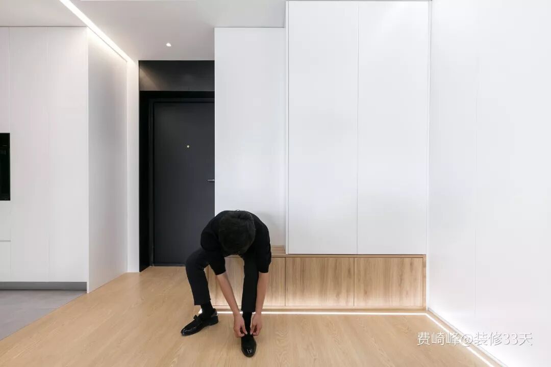 ▲ 玄关,白与木的搭配,让延伸部分成为换鞋凳,从入口到餐厅区,整个转角全部设计隐形式收纳