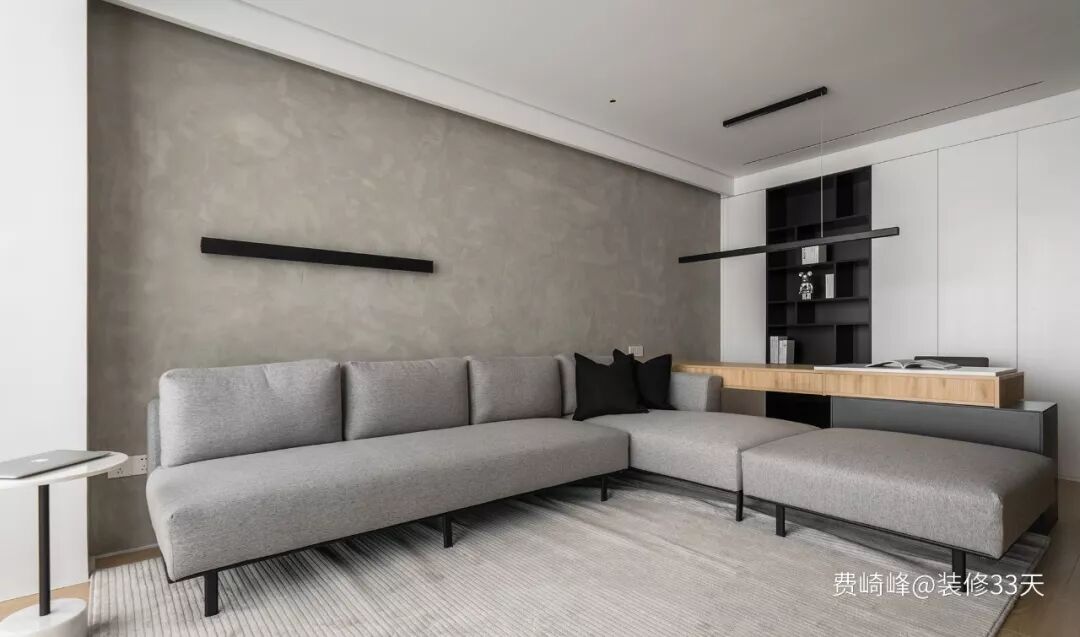 ▲ 沙发背景采用水泥色艺术涂料通过简单的黑色线条壁灯点缀,搭配L型灰色布艺沙发与浅灰色地毯