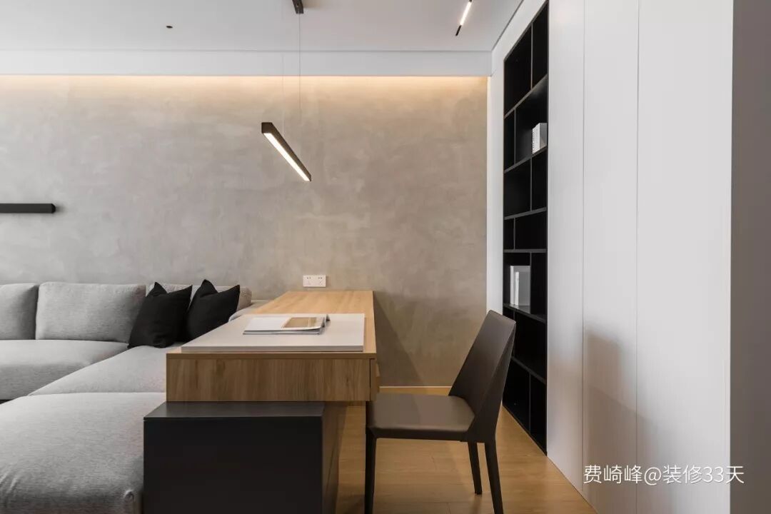 ▲ 在客厅的一侧留出空间布置成开放式书房,面对180度江景,让在家办公成为享受,原木色书桌搭配黑色金属铁艺脚,另一头搭载黑色抽屉上,可活动调节,黑白色半开放式壁柜做储物背景