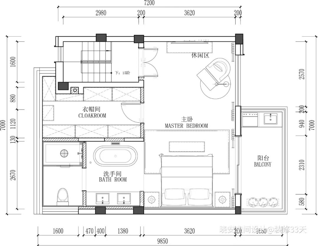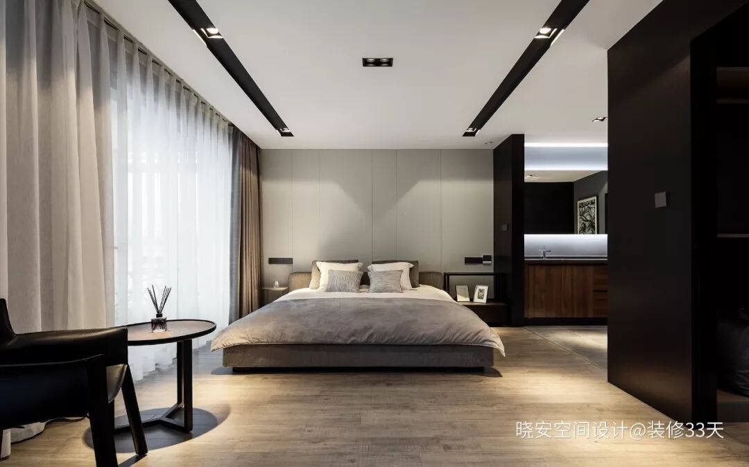 ▲ 设计师将三楼整层设计成酒店式的套间,房间里面有休闲区、睡眠区、衣帽间、卫浴间,整体采用黑白灰色系