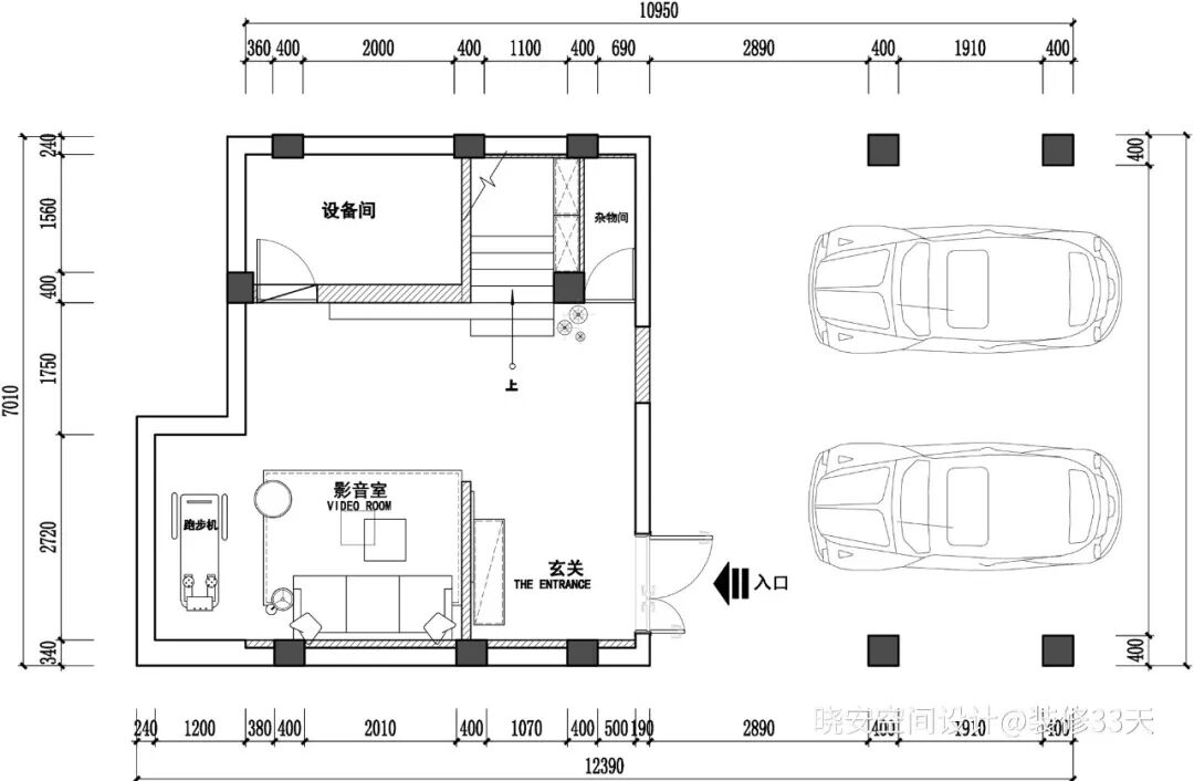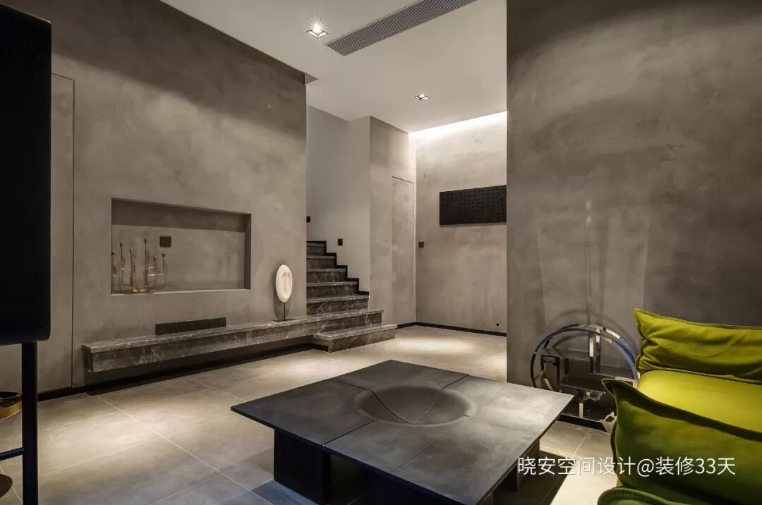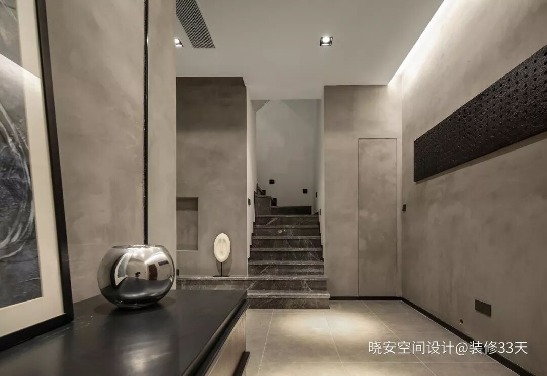 ▲ 入户玄关在地下室,经过玄关是影音室,水泥墙与水泥地砖融合,给人粗犷原始的质感,改变了楼梯方向,增加了储物间