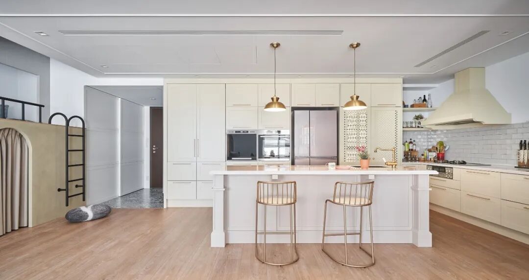 橱柜整体以奶油色为主,以黄铜、金色的把手和小物点缀,在复古素雅的气质中藏不住精致的品味。
