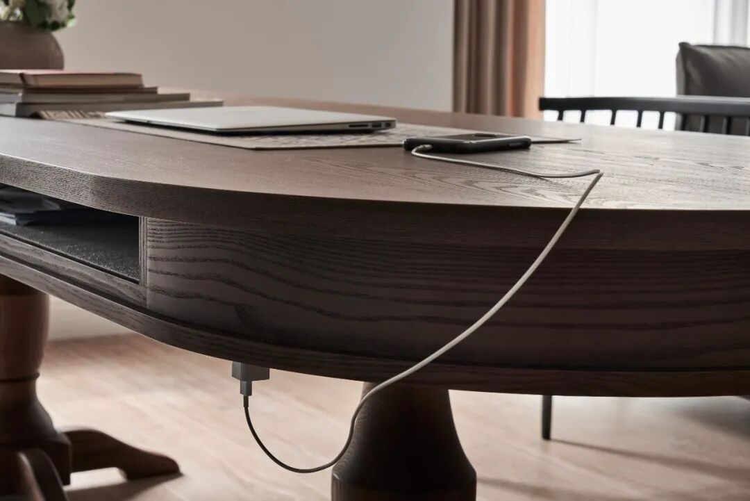 作为书桌来说,靠内侧设计了薄的大抽屉,可以迅速清空桌面的办公用品,切换办公和用餐模式,桌底也隐藏设计了插座。
