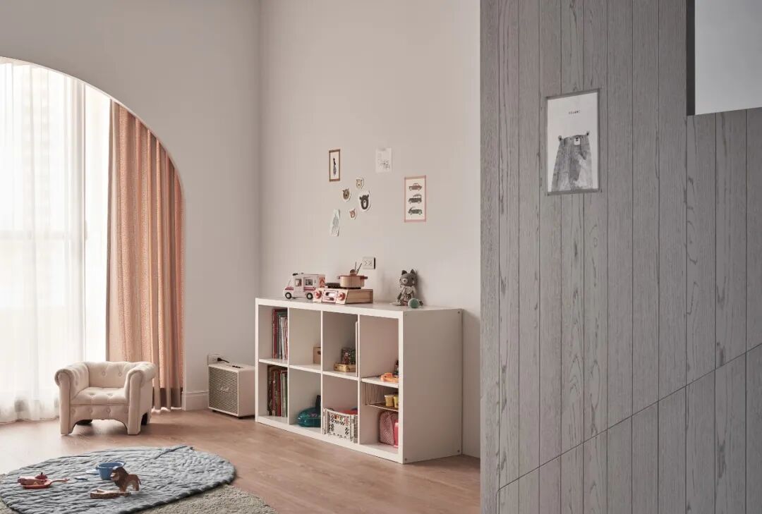 儿童房采用的是浅蓝色基调,进门的柜子侧面采用的是格子设计,可以放一些经常需要取用的物品。