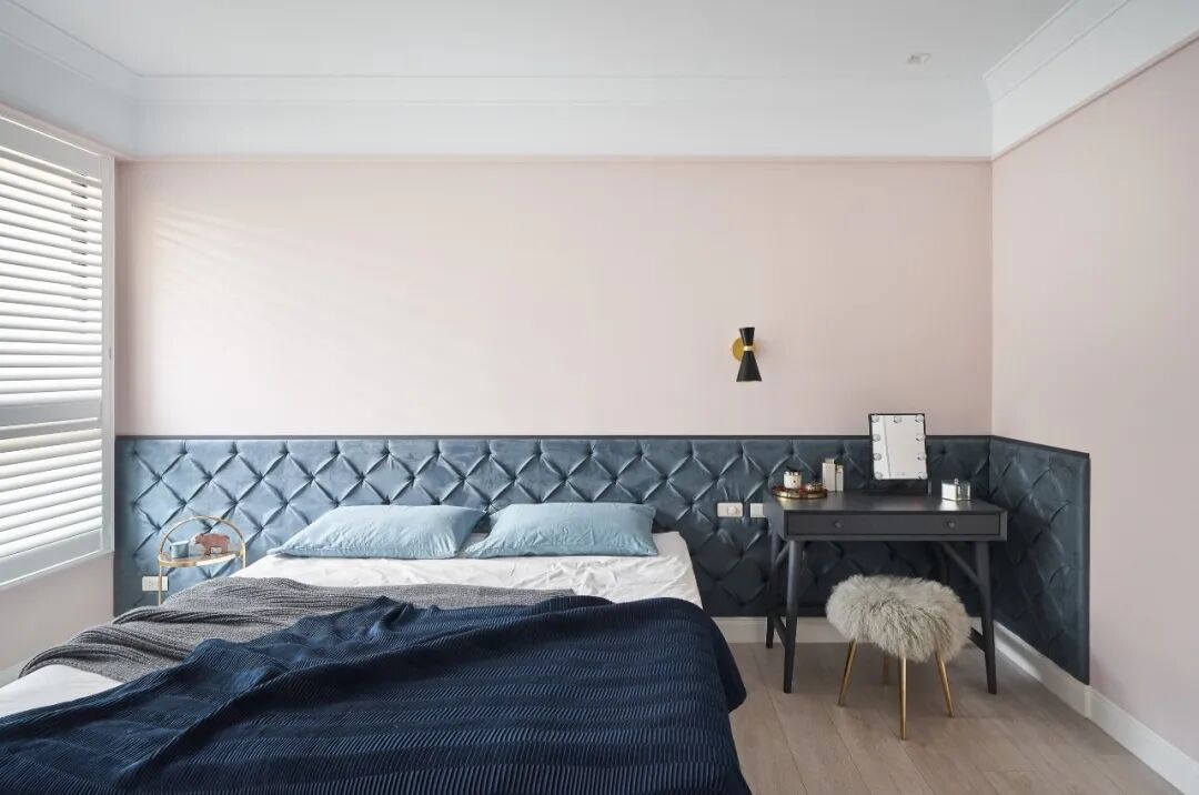 色调上采用了脏粉色乳胶漆为基础,配合藏青色,甜蜜又稳重。