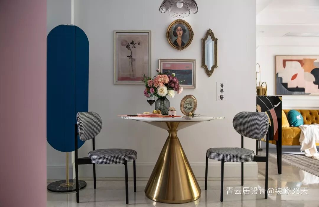 ▲ 干净漂亮的餐厅,金属质感与大理石结合的餐桌,各种颜色的插花与组装画,作为空间的点缀,营造氛围