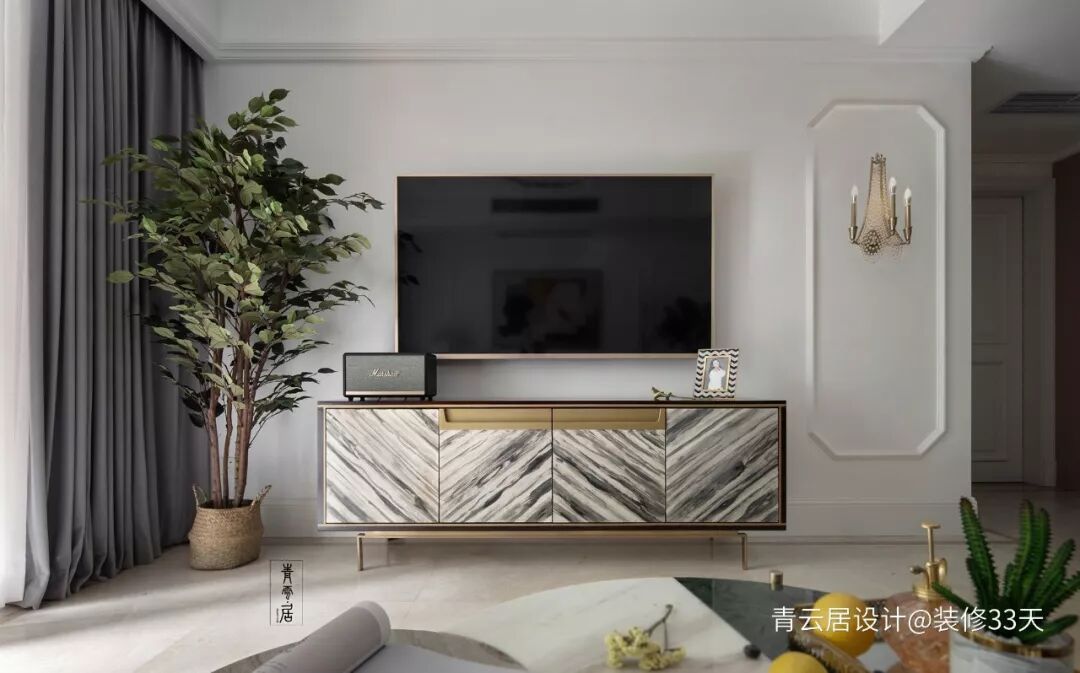 ▲ 客厅,将原墙面的墙纸和电视背景墙进行拆除,墙面批腻子后用线条做装饰,打造出精致优雅的空间表情