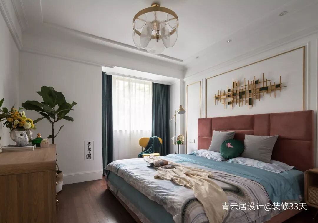 ▲ 主卧,干净的白色基调,搭配地板与多斗柜的木色,墨绿色窗帘与皮粉色床头软靠撞色处理十分惊艳