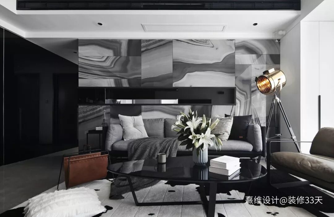 ▲ 沙发背景墙选用墙砖铺贴,纹理如同行云流水的艺术画,中间镂空部分贴黑色镜面,即便是黑白色系也让人感觉绚丽多彩
