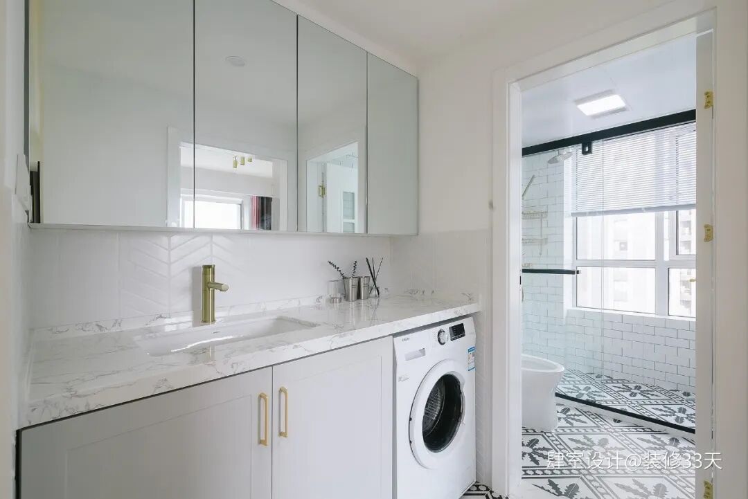 ▲ 卫生间干湿分区,干区兼具洗衣区功能,花砖地面一直从干区延伸至湿区