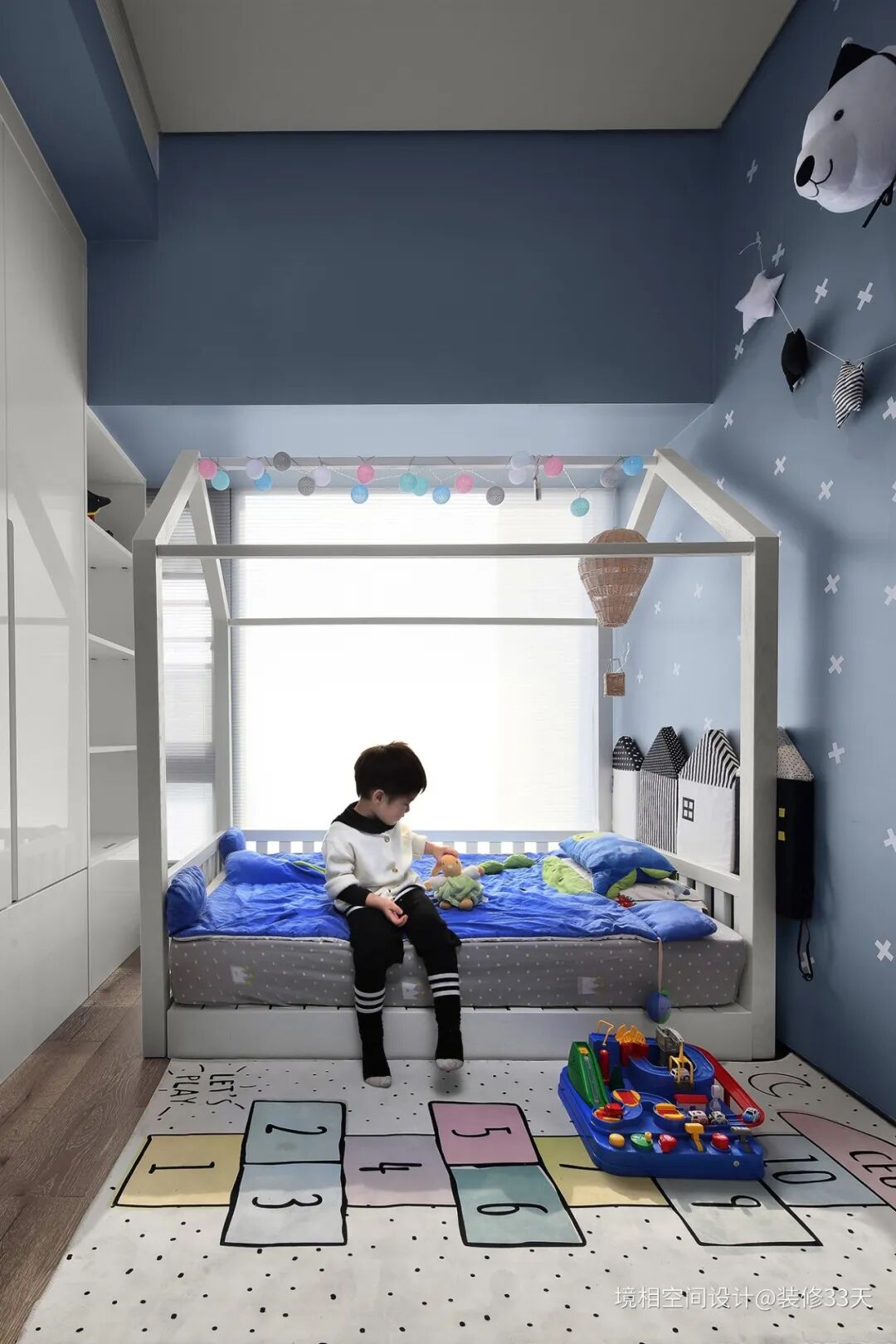 ▲ 儿童房,局部顶面涂刷天蓝色墙漆,墙面铺贴蓝色墙纸,再加上各式各样的装饰品,让儿童房从全屋的沉稳气质中跳出,还给小朋友一个有趣可爱的世界