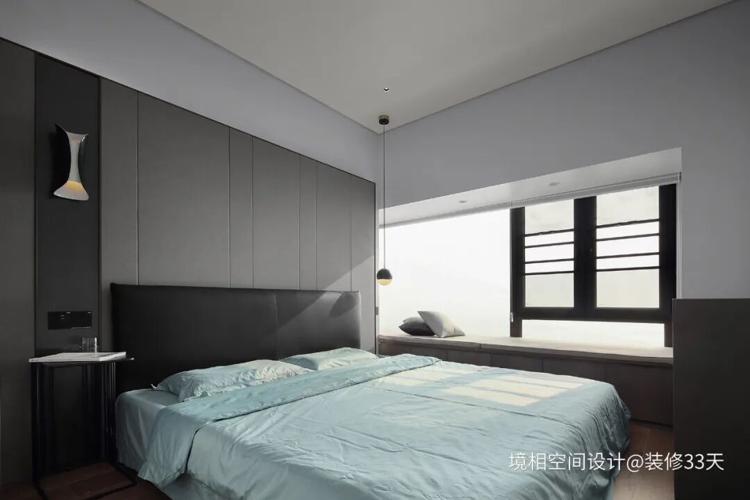 ▲ 主卧床头背景墙选用硬包混搭哑光钢板,再与黑色床头进行混搭,寥寥几笔便将卧室的硬朗勾勒出来