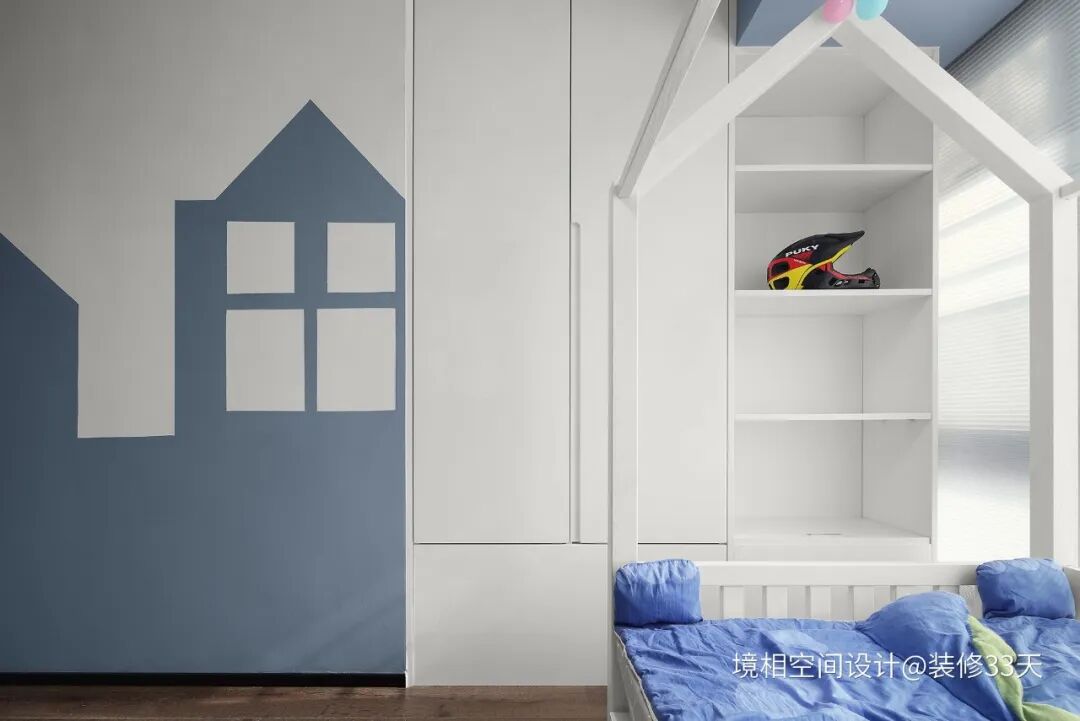 ▲ 衣柜柜面上刻画出蓝色的房子,与墙体、床架刚好形成呼应,角落的开放式储物格是多功能收纳,既可以放玩具衣服,也可以当做书架