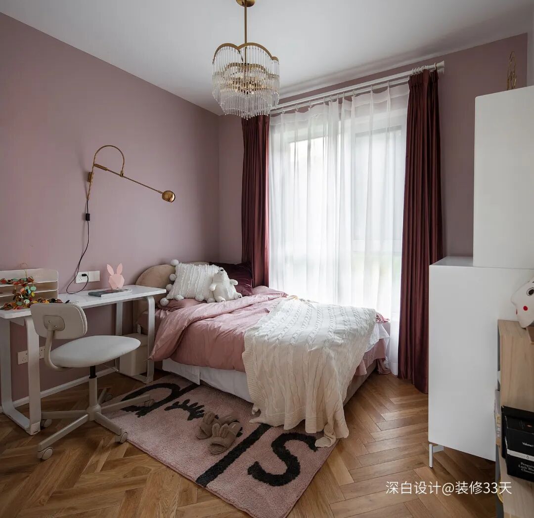 ▲ 儿童房,主题色使用粉和白,粉色大面积使用在墙面,通过白色过渡,床品地毯都采用柔软的针织毛绒材质,打造一个如梦似幻的公主卧房