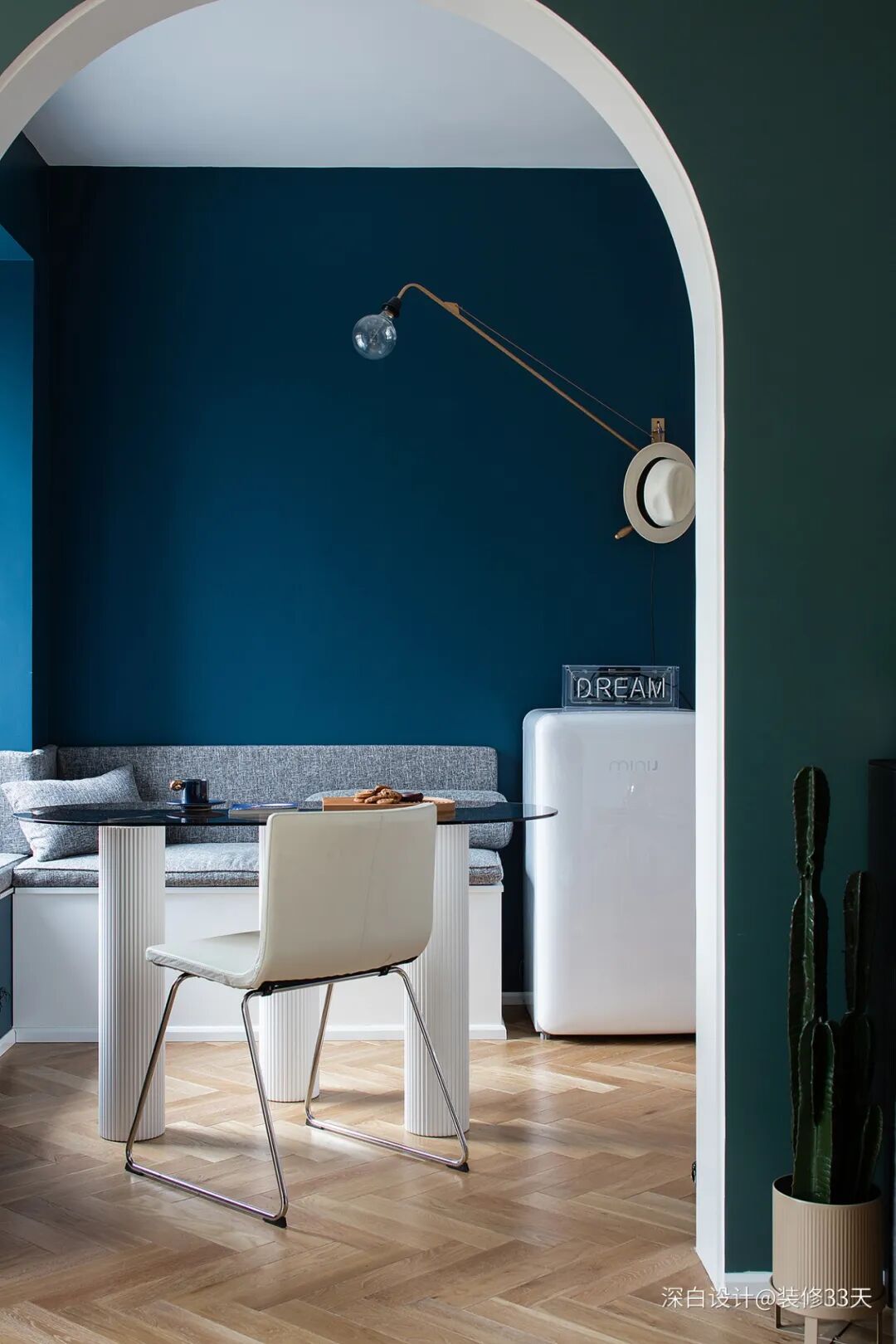 ▲ 餐厅的餐桌较小,简约造型,蓝白色北欧餐椅,清新配色和地面很配,深色人物背景画和同色收纳柜在色彩上形成呼应,角落一株绿植增加生活气息,黄铜材质的吊灯提供餐厅的焦点照明,画龙点睛