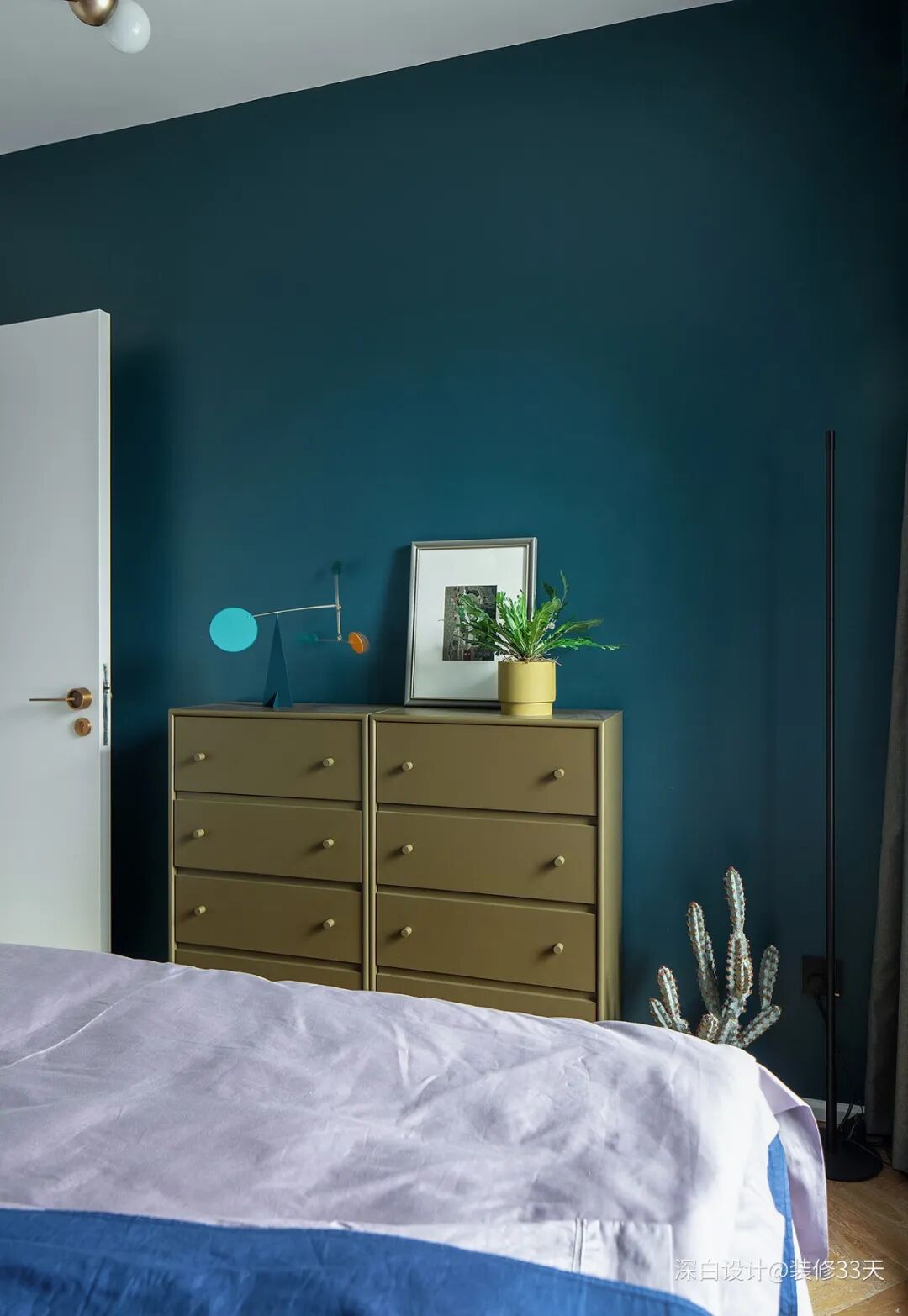 ▲ 床尾,复古蓝墙面和黄铜色收纳柜,搭配出色彩带来的视觉张力