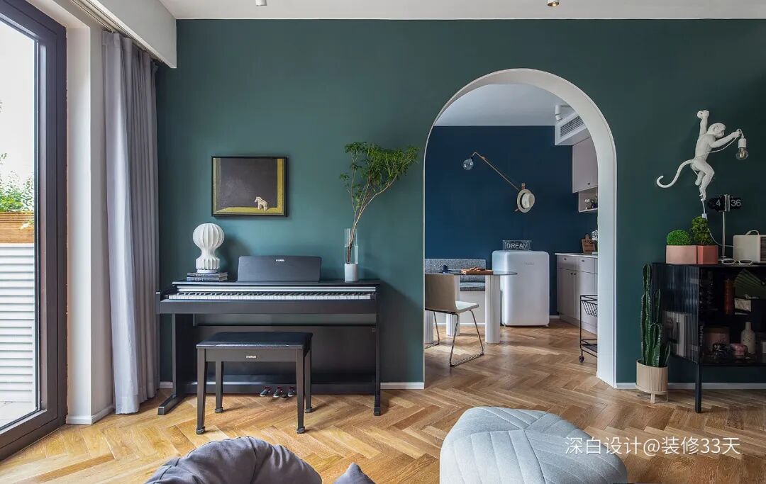 ▲ 阅读起居室另一边墙放置钢琴,使用大面积的有色墙营造北欧风情,吊顶和拱门内侧留白,以色块进行区分过渡,充满时尚气息