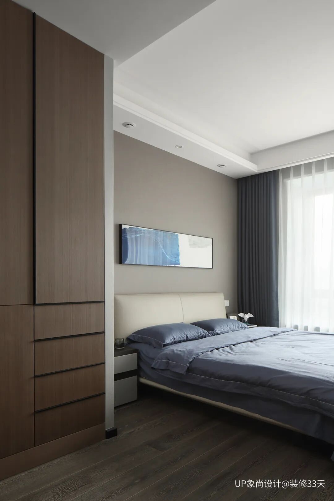 ▲ 客卧作为备用房间,整体处理以简约为主,背景墙体与原木柜门制造自然的色调,同时在软装上更多的使用蓝色调,保证整体空间的色调完整