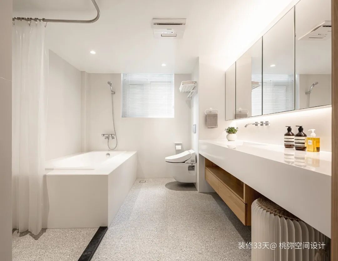 ▲ 调整空间结构扩充主卫空间,容下超长台面+马桶+淋浴+浴缸,镜柜用来放置女屋主的化妆品,空间功能十分齐全