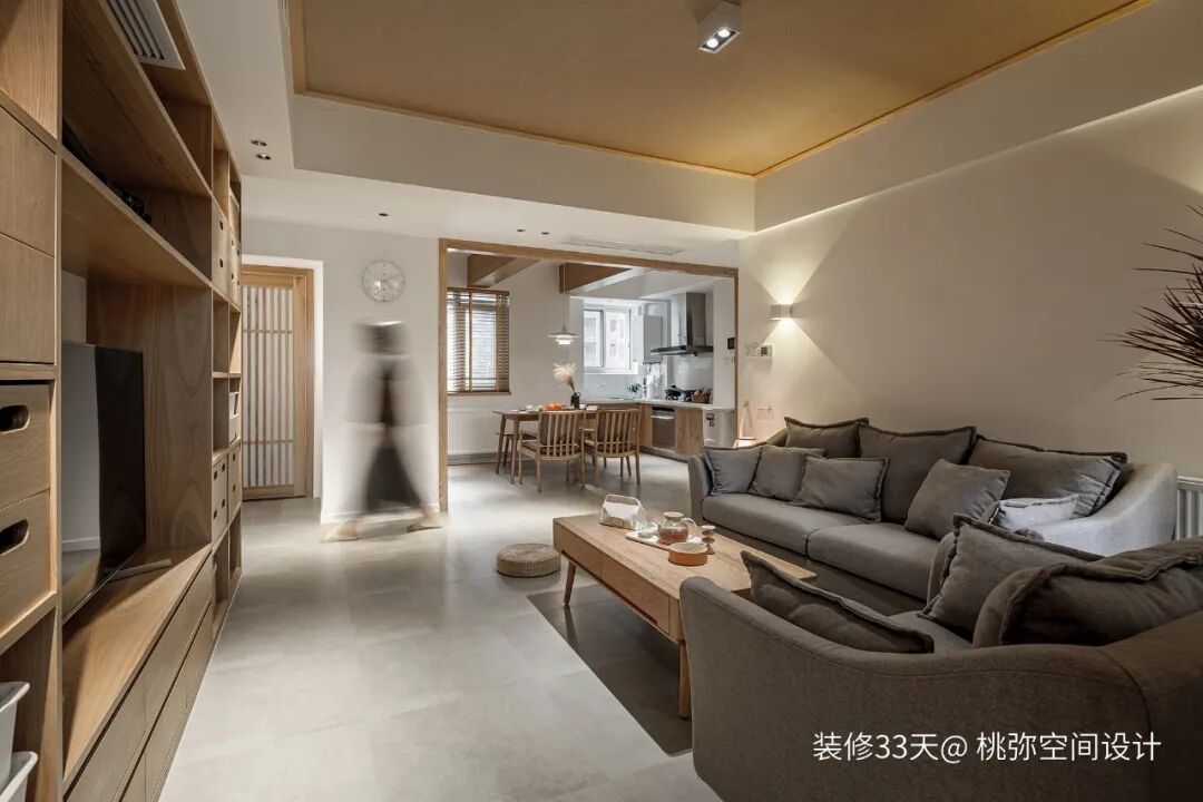 ▲ 客厅,地面通铺水泥瓷砖,吊顶被整块木板包裹,采用点光源取代主灯设计,MUJI风电视柜无论是放日用品还是装饰品都便利十足,无形中也扩大视觉效果