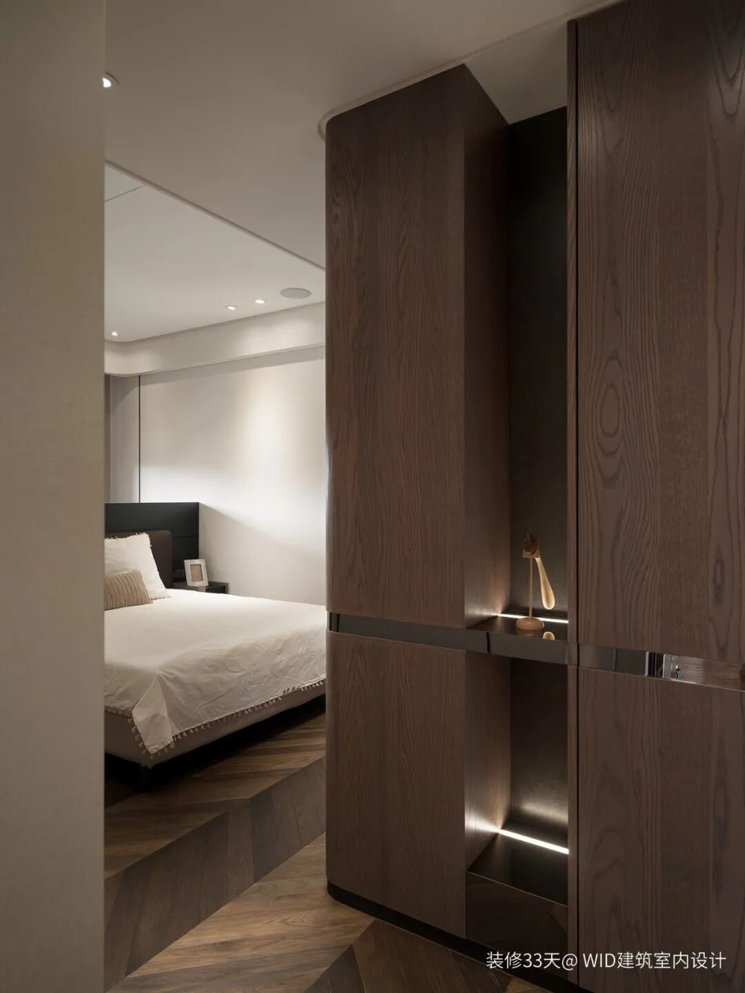 ▲ 通往卫生间的过道利用起来打造次卧衣帽间,延续木质温润基调,提升卧室收纳能力