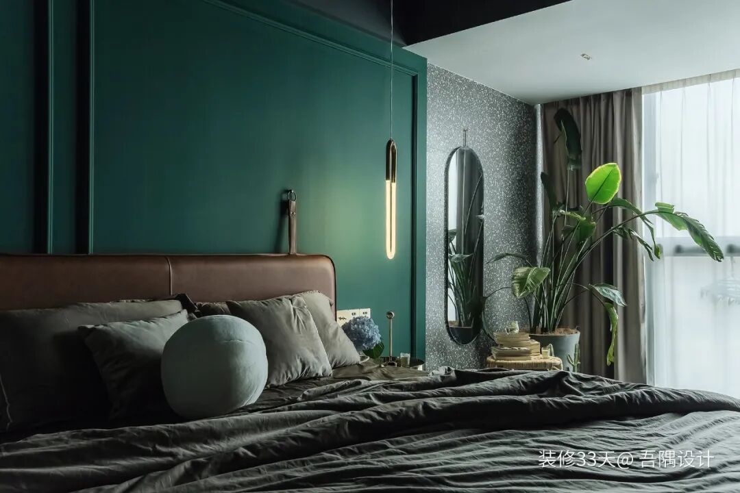▲ 在色彩搭配上女主偏爱浓郁的色彩,而男主人喜欢莫兰迪色,所以在公共空间综合两人的喜好,卧室区则以女主人的选择为主,通过硬装营造复古情调,但是在软装灯具上,选一些偏现代的造型,通过古典和现代的碰撞融合,让视觉更有延续性