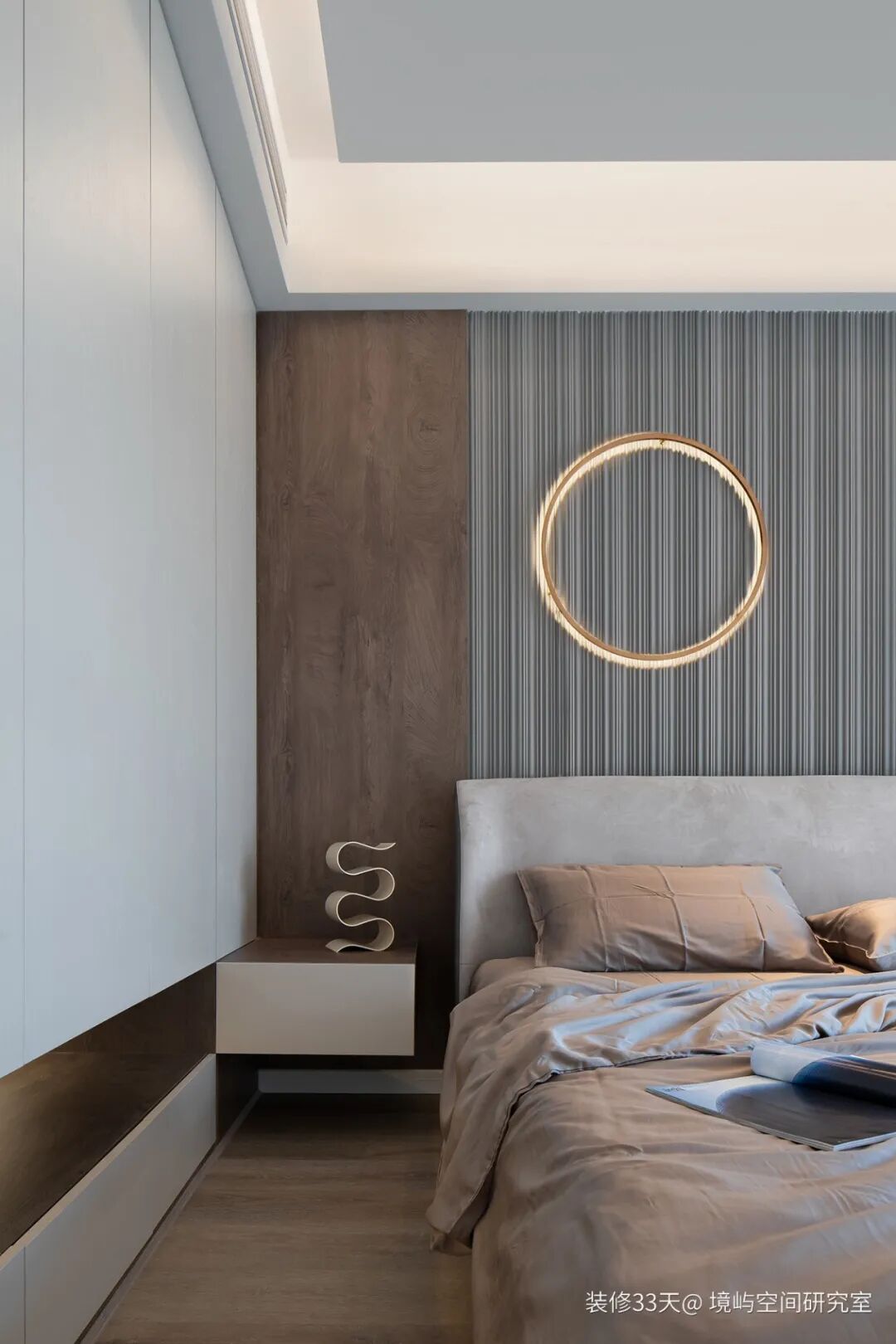 ▲ 主卧纳入阳台,扩大使用面积与采光,灰色波浪板背景搭配金属极简的壁灯,层次感十足