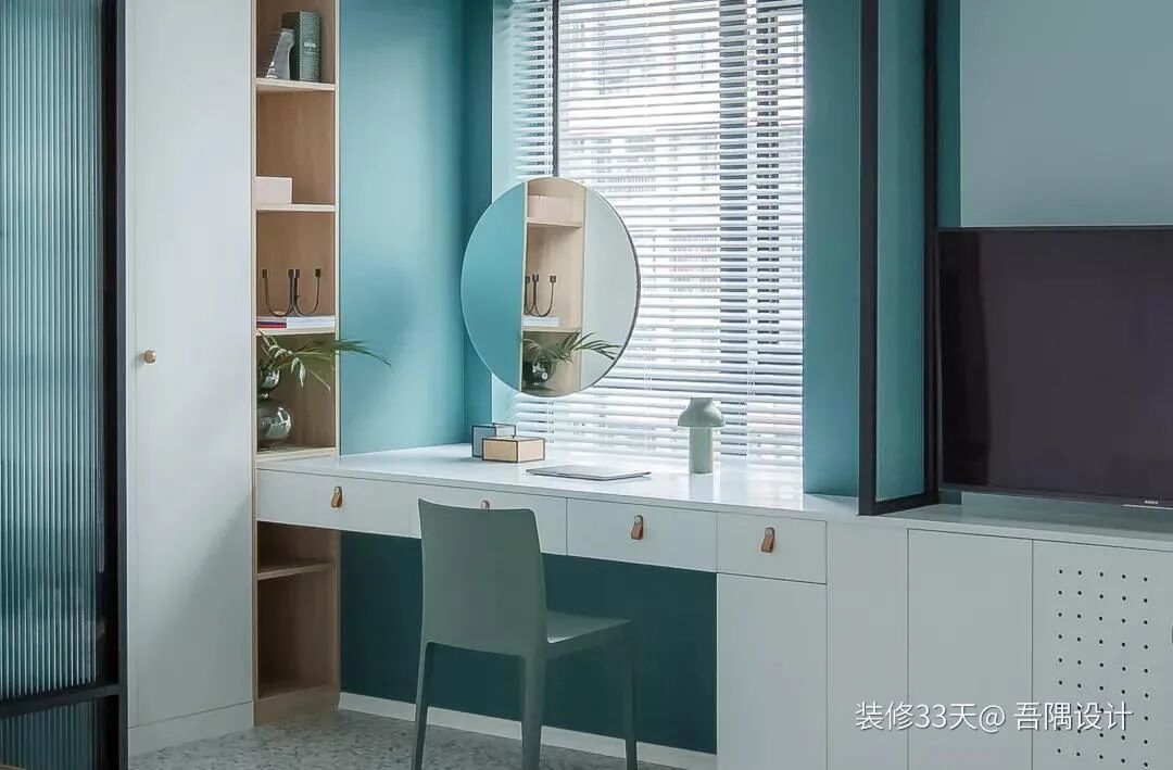 ▲ 梳妆台与相邻电视区的柜子连成一体,节约储物空间的同时让视觉更规整