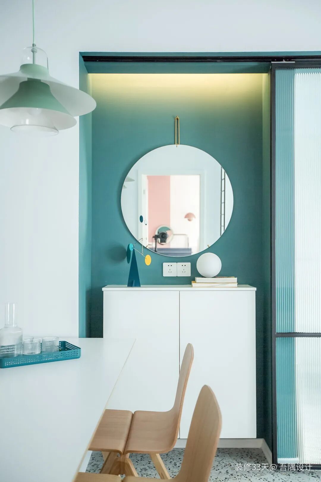 ▲ 虽然主卫空间很小,但还是嵌入了一个屋主梦想中的浴缸,将墙面和地面做了一体化的处理,模糊了空间感,绿色花砖、圆镜与白色柜体与整屋保持一致风格,细节却有更多不同