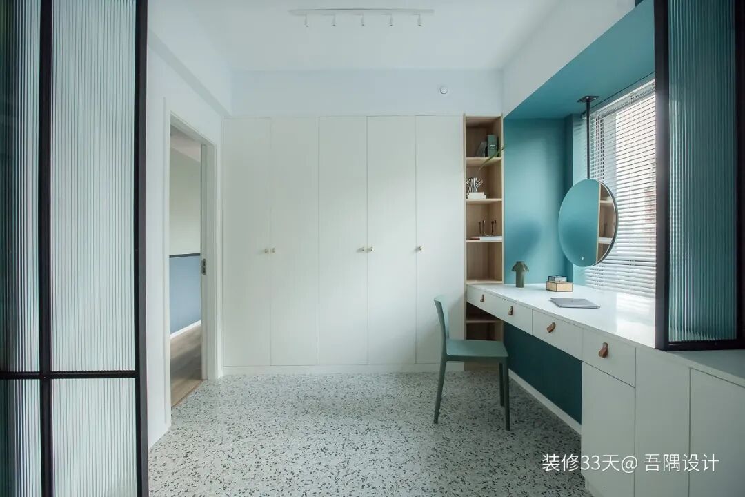 ▲ 衣帽间延续水磨石地面,沿窗打造梳妆台,既能化妆也能当书桌,左手边做了一列开放格,补充置物功能