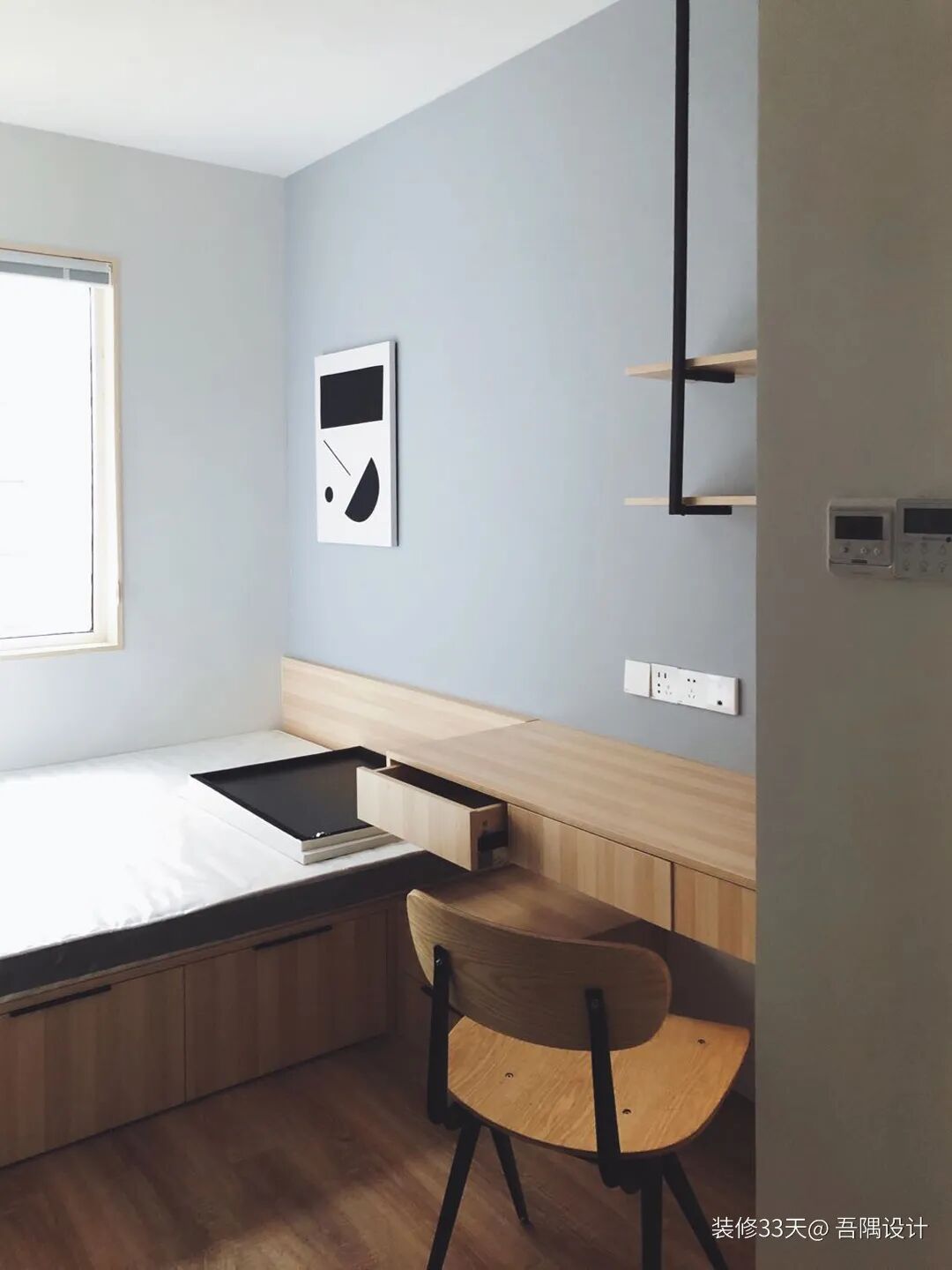 ▲ 客卧是为老人准备的,老人偶尔回来小住,根据他们的生活习惯,把床和梳妆台做了统一定制,床下部分作为收纳,最大化利用了空间