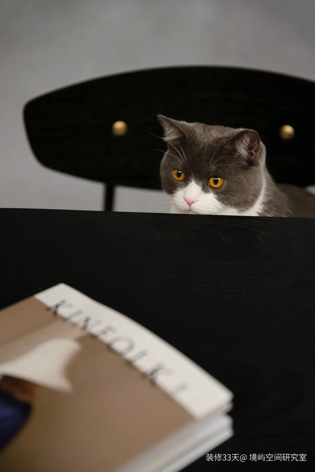 ▲ 电视背景是一组整面悬空高柜与抽屉设计,部分开放格摆放书籍,满足屋主阅读需求,嵌入式电视的设计提升墙面的整体性,同时空间对立面利用黑色与灰色明度差保证视觉上的拉升与张力
