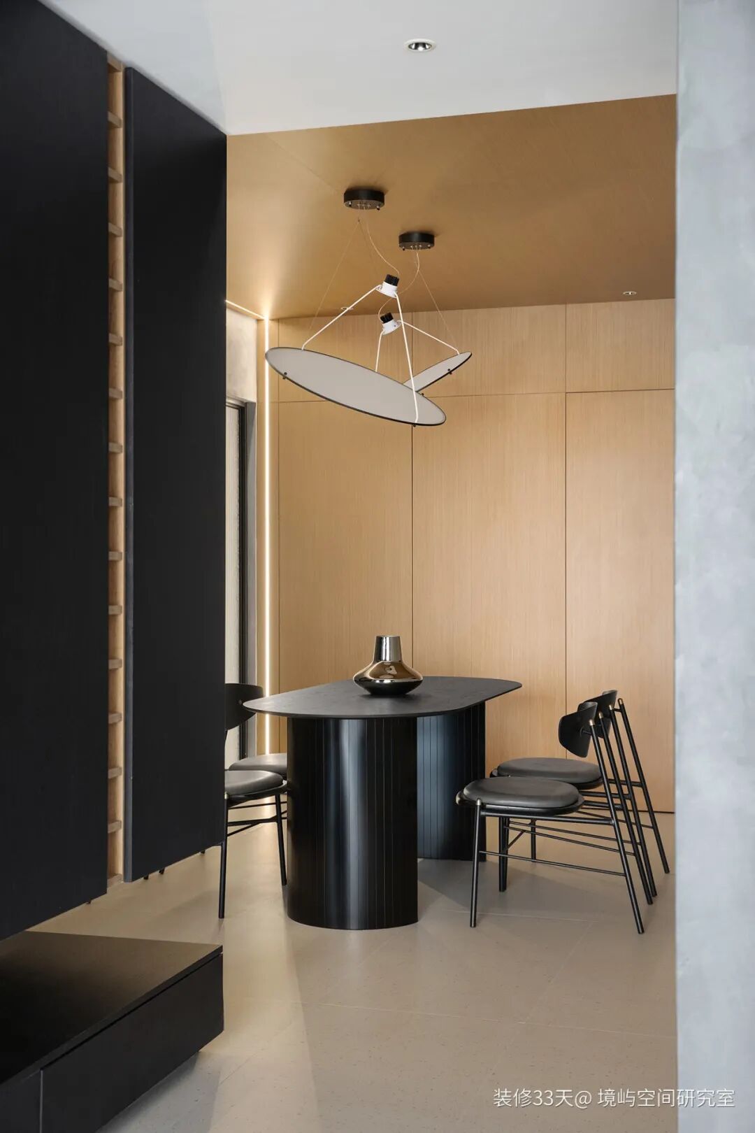 ▲ 餐厅顶面与次卧墙面材质上统一,形成视觉延伸感,也为了打破餐厅门洞过多的困扰,通过面与面相互链接空间让局促的餐厅看起来开阔宽敞